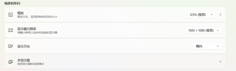 1.检测分辨率。在系统-屏幕-缩放和布局下面可以选择屏幕分辨率和缩放,调到合适大小。