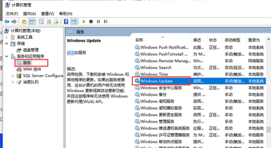 点击服务和应用程序,选择服务,然后在服务选项中找到Windows update