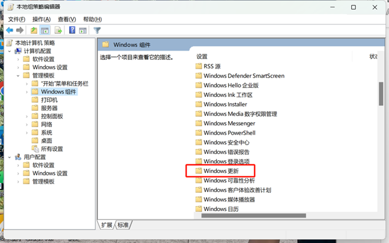 方法三,关闭更新策略。打开本地组策略编辑器(Win+R,输入gpedit.msc),点击计算机配置,在打开管理模块,找到Winodws组件,再点开Windows更新
