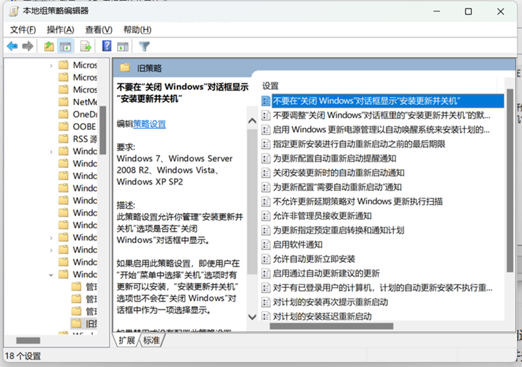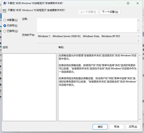 找到“不要在‘关闭Windows’对话框显示‘安装更新并关机’”